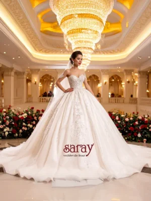 Das Brautkleid Modell Ina aus der exklusiven Saray Kollektion Brautkleider ist ein opulentes Prinzessinnenkleid, das entworfen wurde, um zu verzaubern. Schon auf den ersten Blick besticht es durch seine majestätische Silhouette und die Fülle an luxuriösen Details. Es ist ein Kleid, das nicht nur getragen, sondern erlebt wird. Die königliche Eleganz dieses Brautkleides ist in jedem Detail spürbar und macht es zur idealen Wahl für große Hochzeiten und glamouröse Feierlichkeiten.