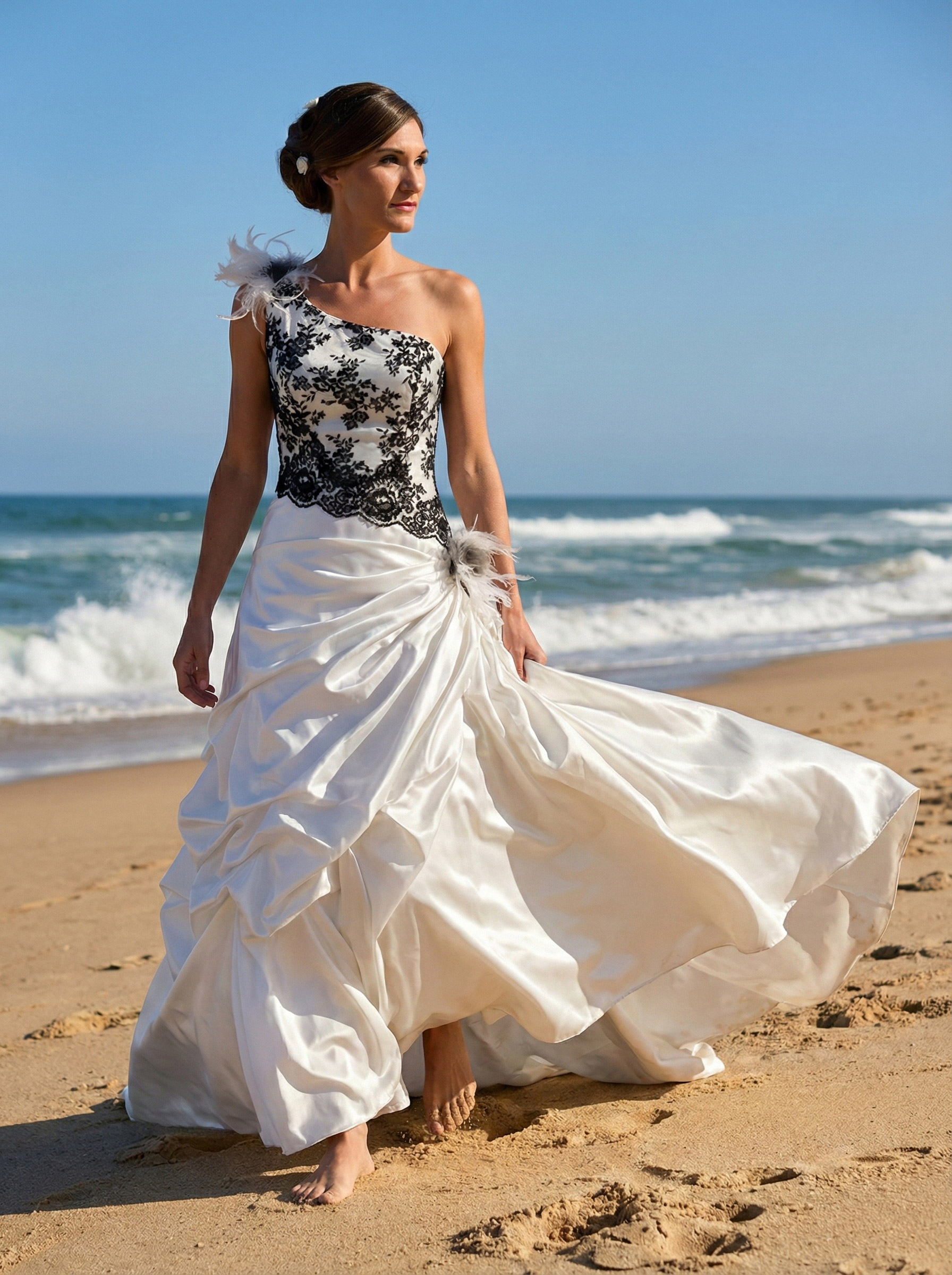 Das Modell Selma ist eine schöne A-Linie aus weichem Taft mit Blickfang-Garantie! Das Oberteil mit einem Schulterträger auf der rechten Seite ist mit wunderschöner schwarzer Spitze bestickt welche leicht Asymmetrisch an der linken Seite der Hüfte zusammenläuft. An dem Schulterträger und an der linken Seite der Hüfte verzieren wunderschöne Blumen aus Feder- und Tüllbesatz nochmals das Brautkleid. Der Rock ist elegant in Asymmetrisch Abständen drapiert.